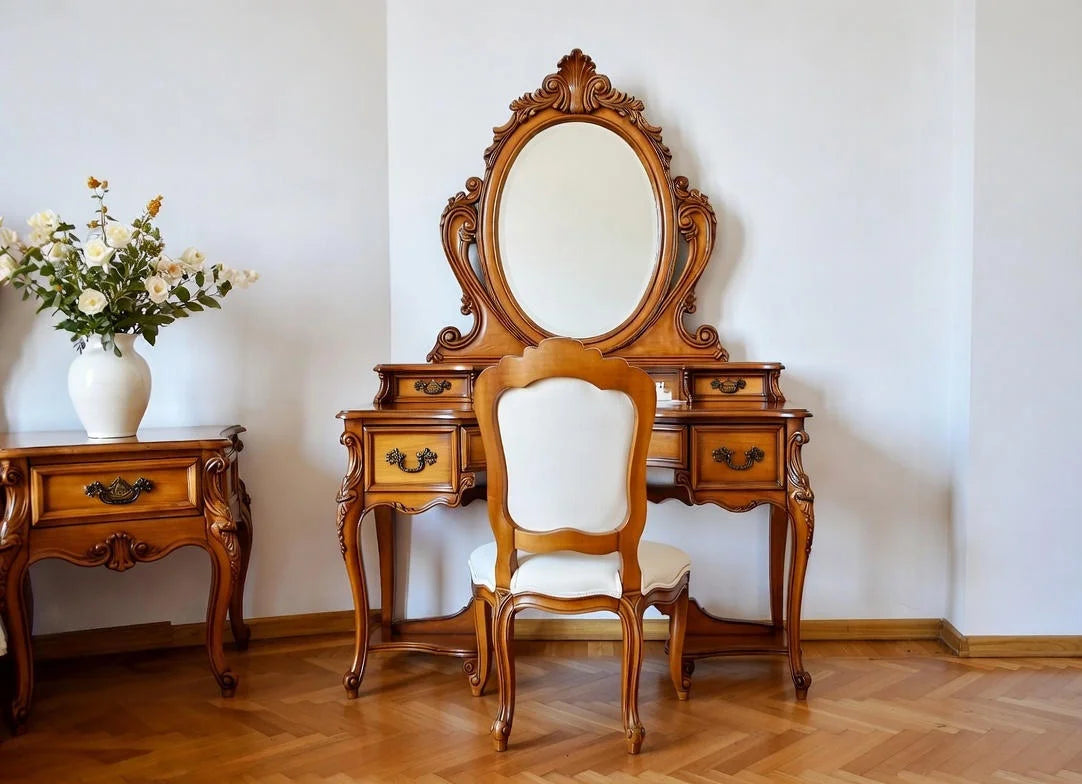Vanity Dressing Table: Delicate design with high cabriole legs, multiple drawers, and a large oval mirror for your daily routine.